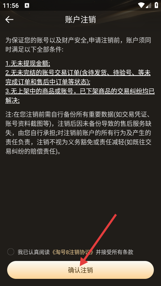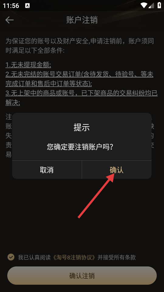 3、在账户注销页面,阅读并同意《淘号8注销协议》后,点击【确认注销】按钮。