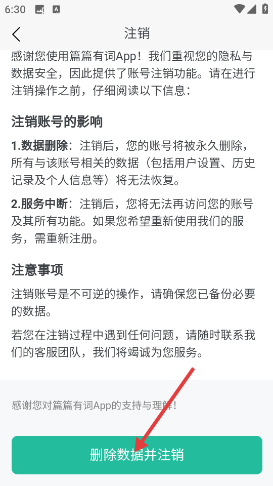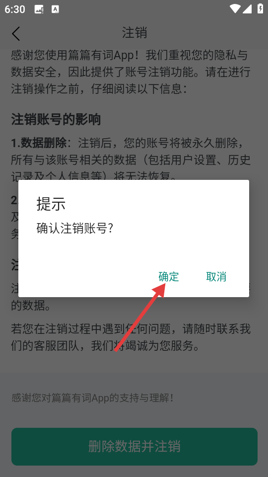 3、在账号注销说明页,点击【删除数据并注销】按钮,可触发注销确认提示框。