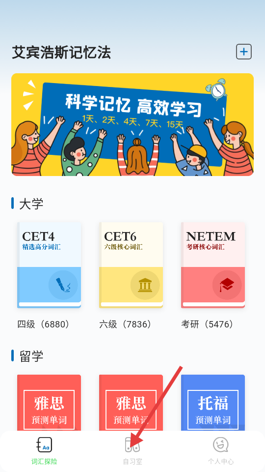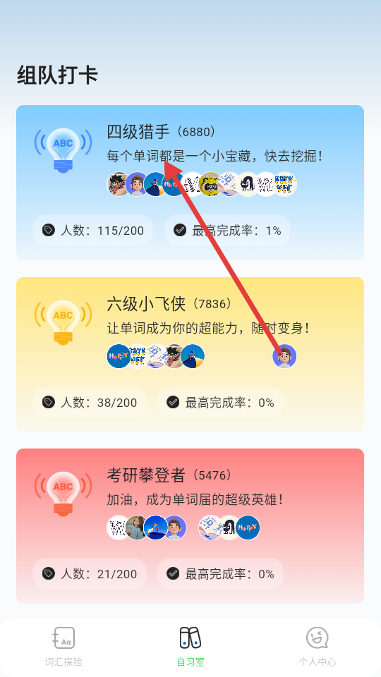 1、点击底部【自习室】,可进入组队打卡页面。