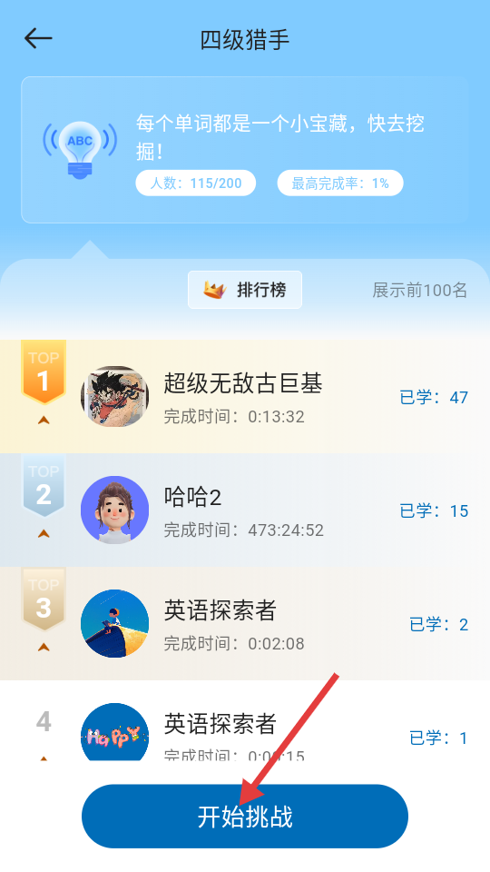 3、在四级猎手详情页,点击【开始挑战】,可进入四级单词挑战答题页面。