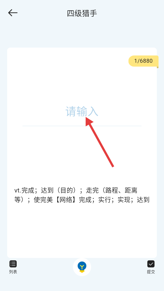 4、在答题页面,根据单词释义,在【请输入】框中输入对应的单词,完成单词挑战。