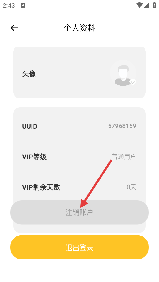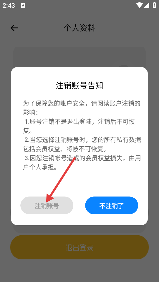 2、在个人资料页面,点击【注销账户】,可弹出注销账号告知框,了解注销影响。
