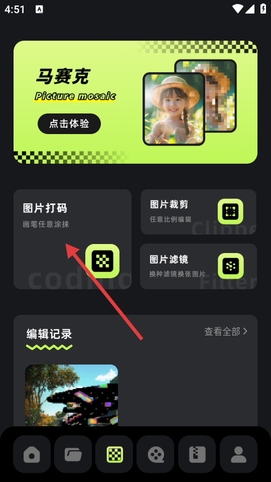 2、在马赛克功能页面,点击【图片打码】,可进入我的相册页面。