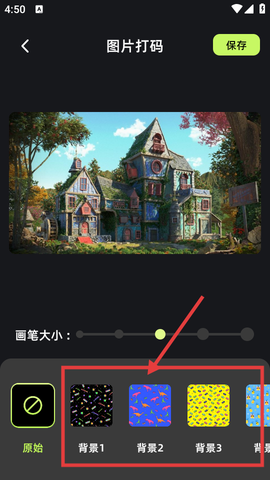 4、在图片打码编辑页,可选择画笔大小和背景样式,对图片进行打码操作,完成后点击【保存】即可。