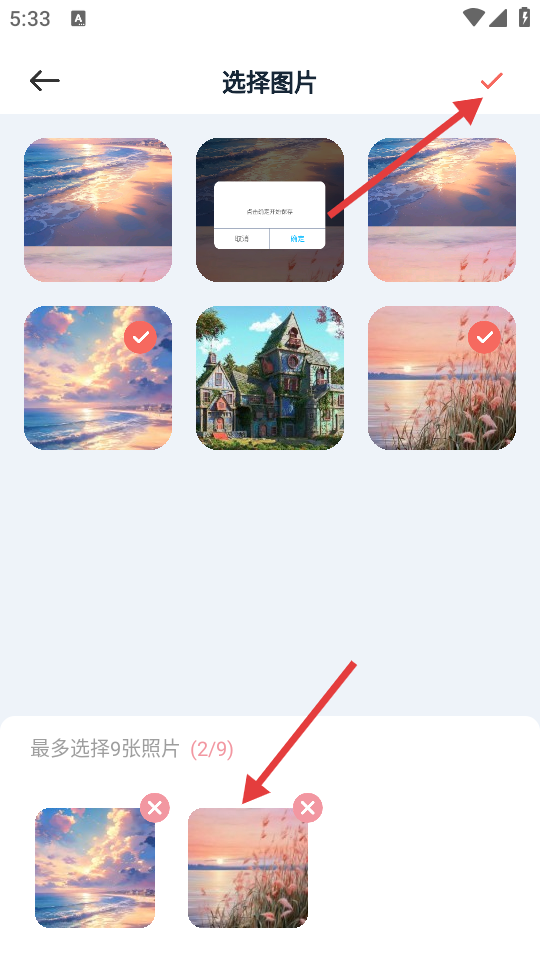 3、在选择图片页面,勾选需要的图片后点击右上角对勾,可进入长图拼接页面。