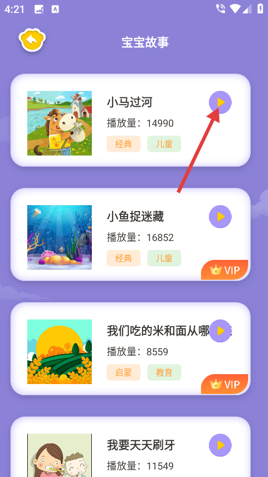3、在宝宝故事列表页面,点击想要收听的故事右侧的播放按钮,进入故事播放页面。