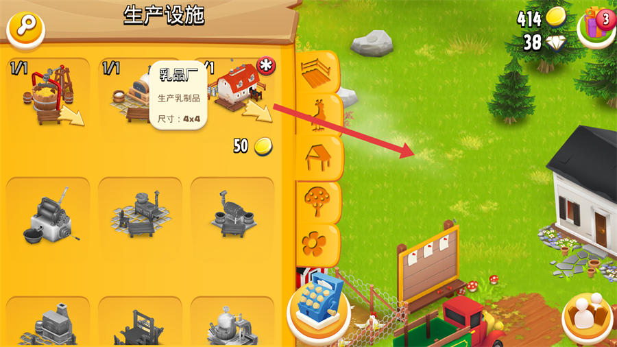 1、在生产设施界面,花费50金币建造【乳品厂】,用于生产乳制品,为农场经营拓展产业链。