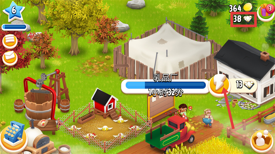 2、乳品厂建造中可消耗钻石加速,如剩余时间1小时32分时,花费13钻石可立即完成建造,提升生产效率。