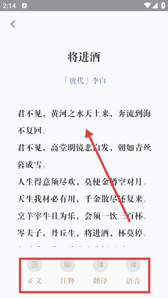 2、在诗词库页面,点击想要查看的古诗词,如【将进酒】。