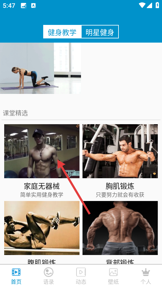 2、在主界面的课堂精选中,点击【家庭无器械】选项,进入其课程列表页面。