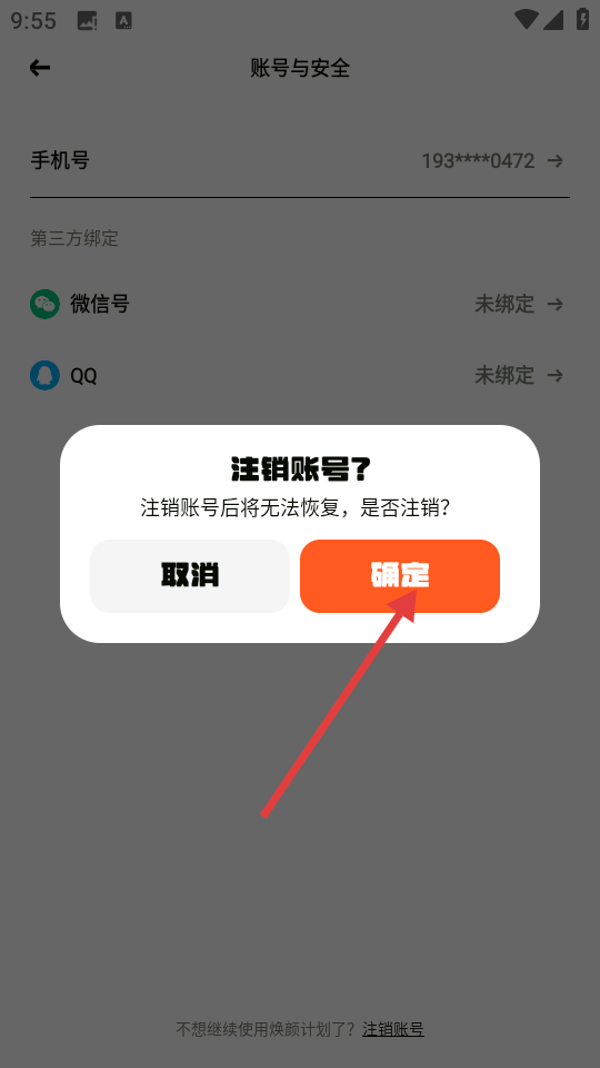 4、在注销账号确认弹窗中,点击【确定】按钮,完成账号注销操作。