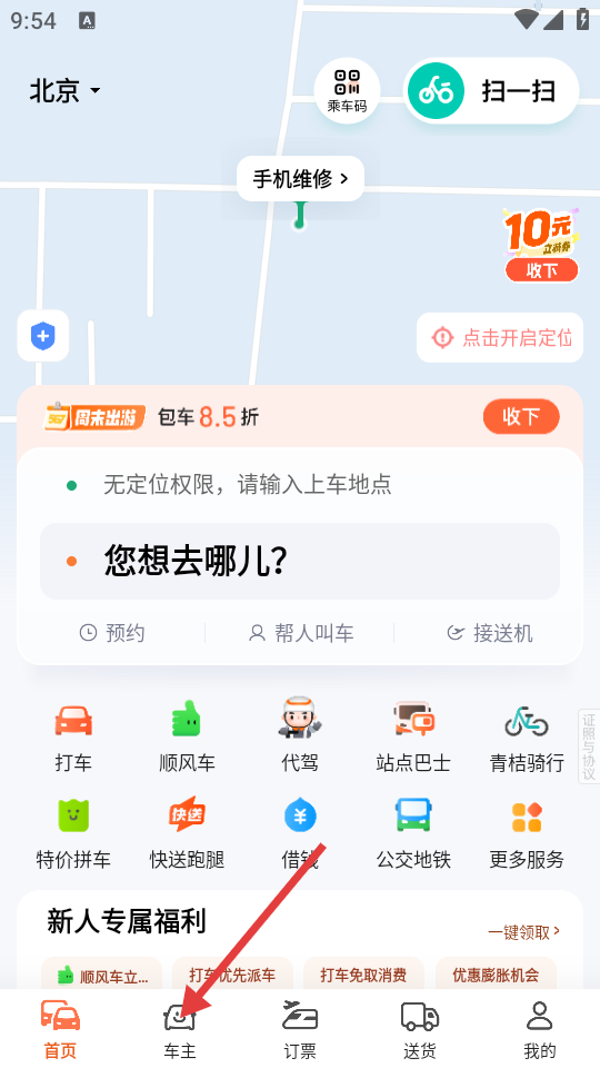1、在首页,点击底部【车主】选项,进入车主服务页面。