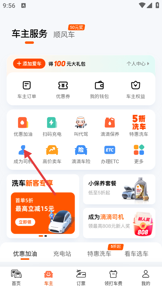 2、在车主服务页面,点击【成为司机】选项,进入加入滴滴页面。
