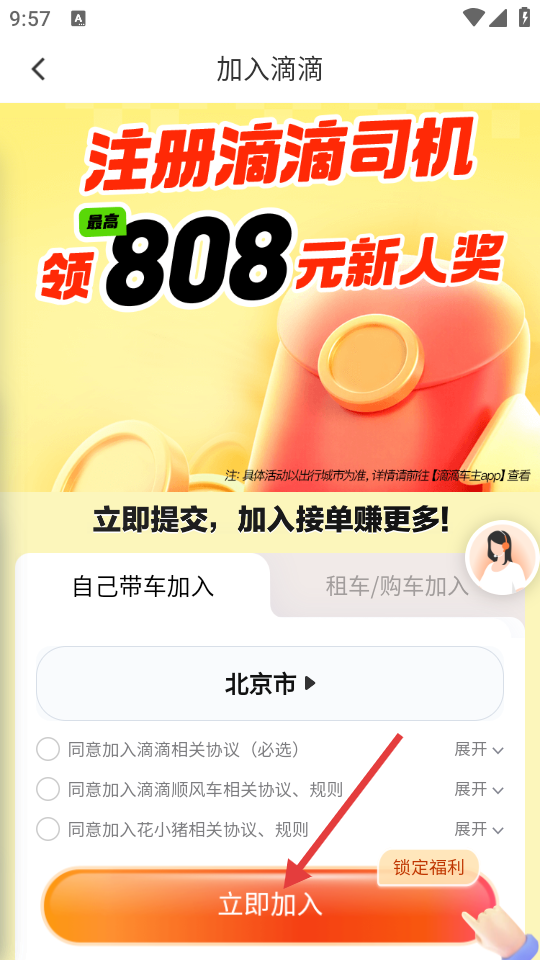3、在加入滴滴页面,选择加入方式并同意相关协议后,点击【立即加入】按钮,进入上传信息页面。