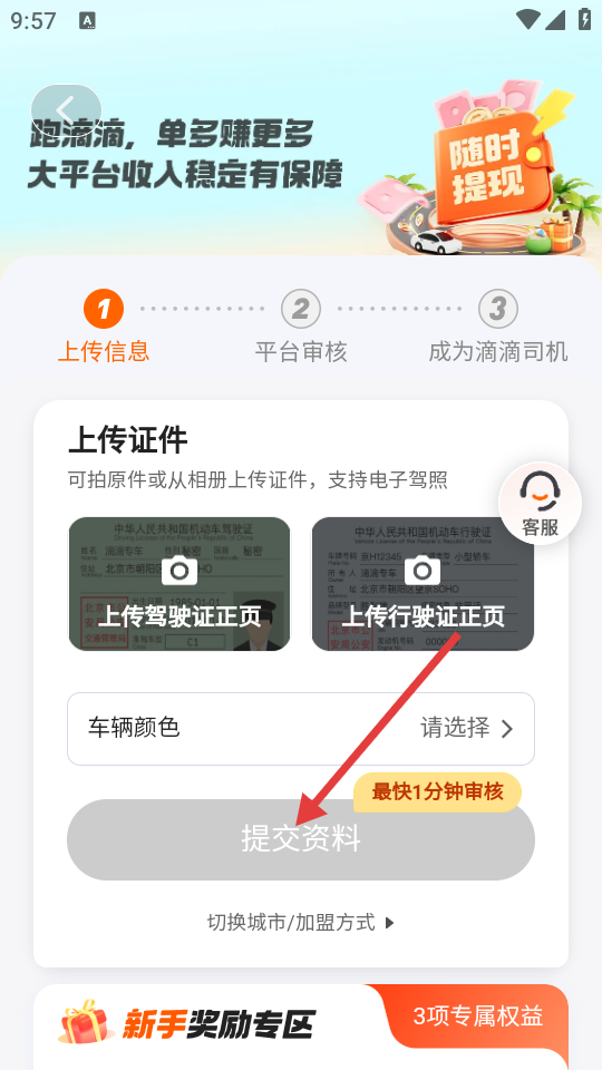 4、在上传信息页面,上传驾驶证、行驶证正页并选择车辆颜色后,点击【提交资料】按钮,完成司机注册资料提交。