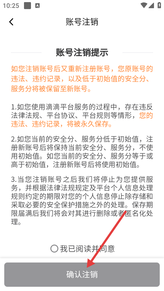 4、在账号注销提示页面,勾选【我已阅读并同意】后,点击【确认注销】按钮,完成账号注销操作。
