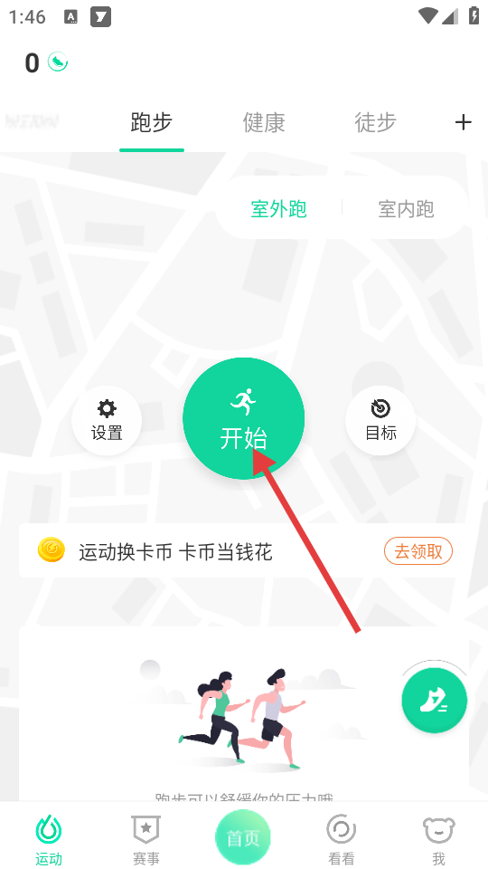 3、在跑步页面,点击【开始】按钮,进入室外跑记录页面。