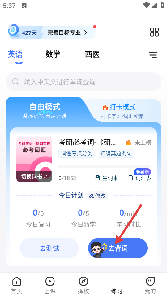2、在练习页面,点击【去背词】按钮,进入考研必考词的学习准备页面。