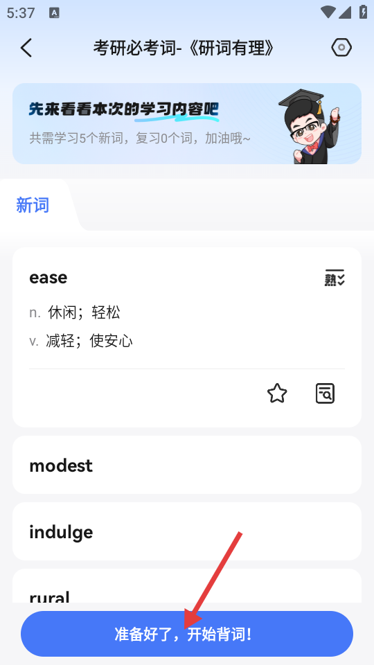 3、在学习准备页面,点击【准备好了,开始背词!】按钮,进入单词学习页面。