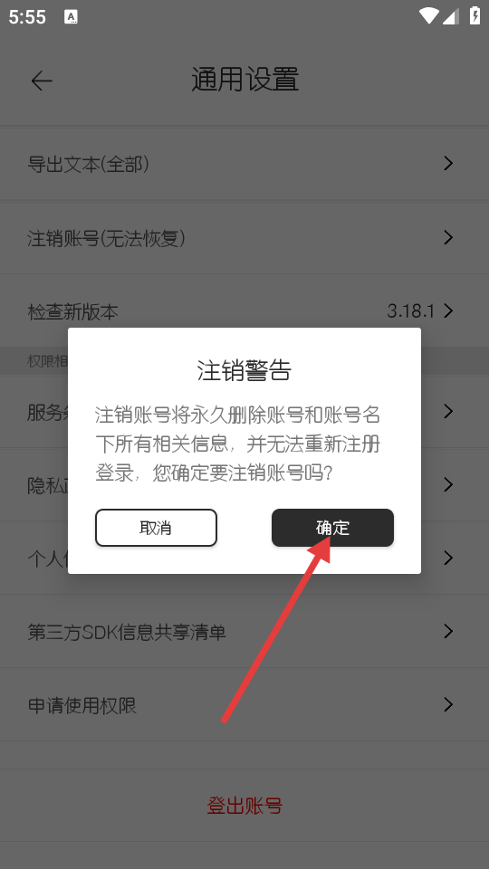4、在注销警告弹窗中,点击【确定】按钮,完成账号注销操作。