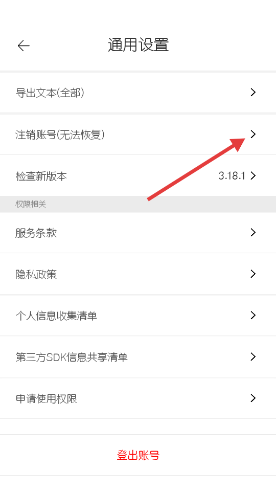 3、在通用设置页面,点击【注销账号(无法恢复)】选项,弹出注销警告弹窗。