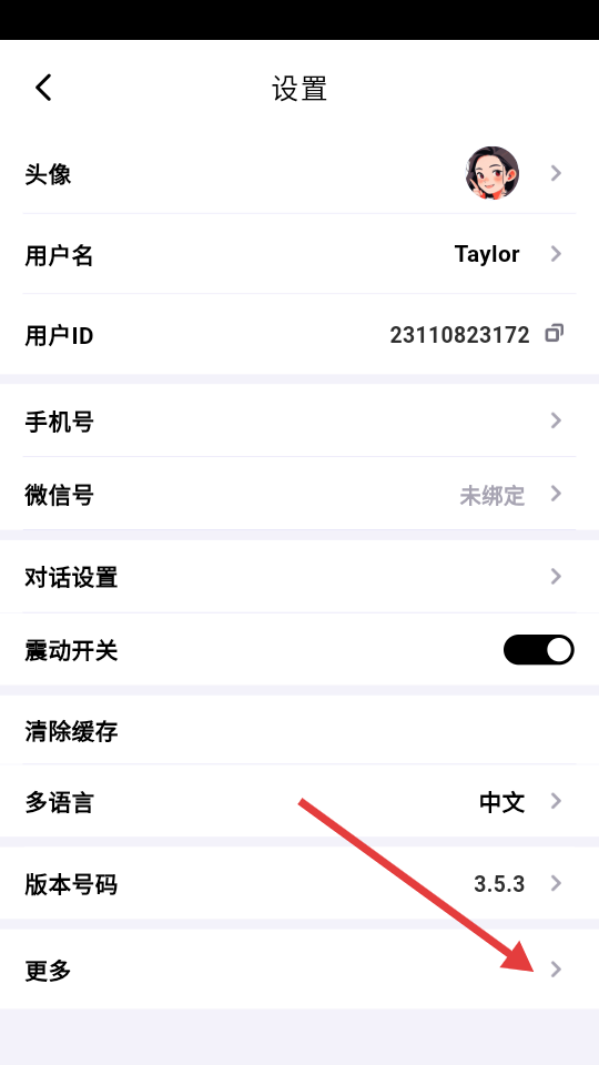 2、在设置页面找到【更多】选项并点击,进入更多设置界面。