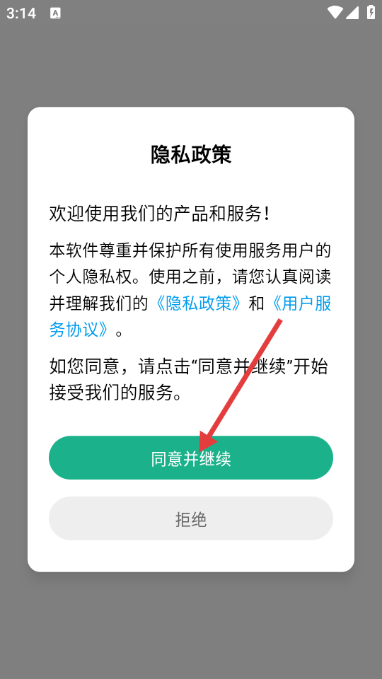1、在隐私政策页面点击【同意并继续】按钮,进入软件主界面。