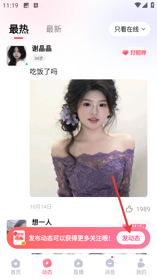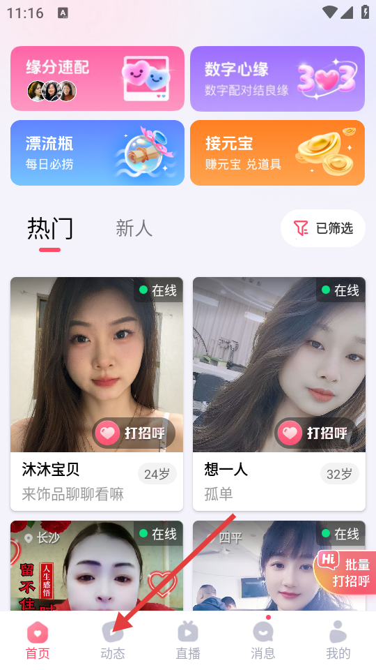 2、在主界面点击底部【动态】选项,进入动态页面。