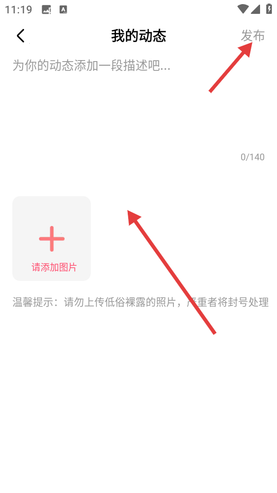 4、在我的动态编辑页面添加图片、输入描述后点击【发布】按钮,完成动态发布。