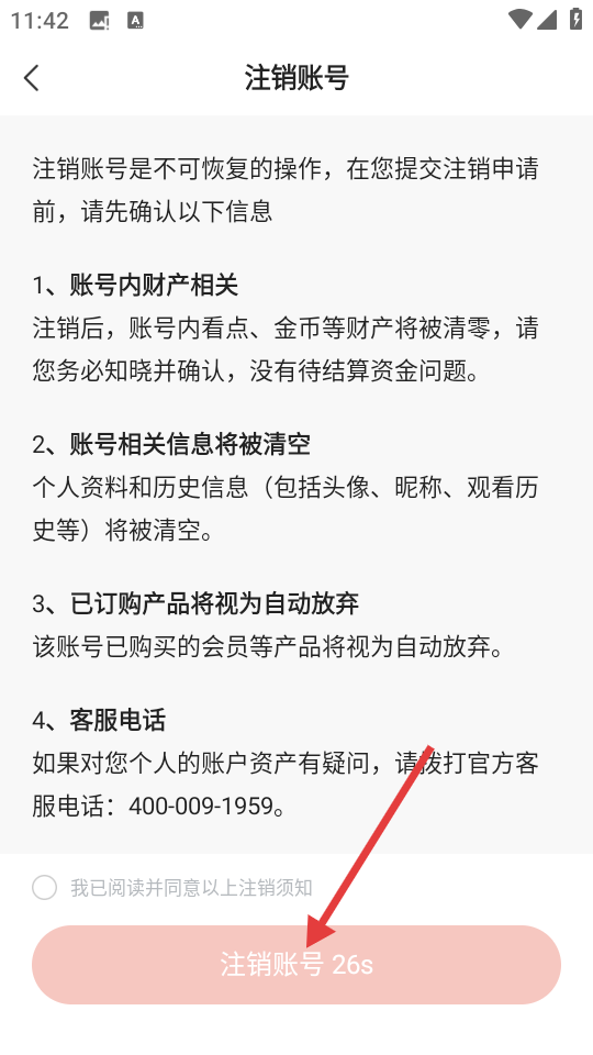 4、在注销账号说明页面阅读须知后,点击【注销账号】按钮,完成账号注销操作。