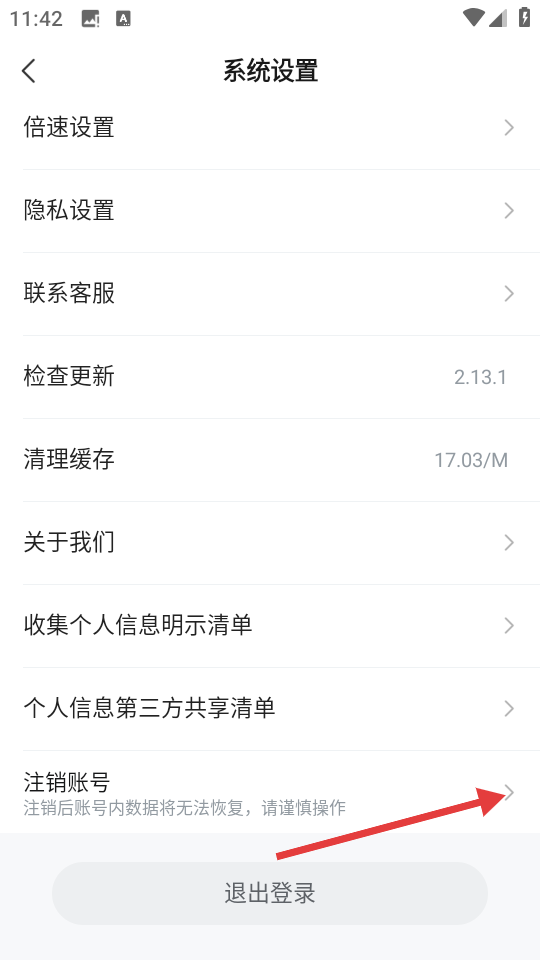 3、在系统设置页面点击【注销账号】选项,进入注销账号说明页面。