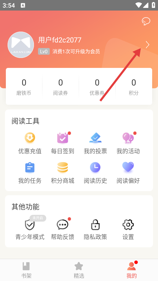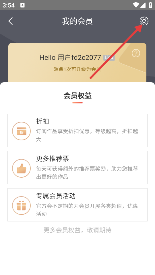 1、在【我的】页面点击右上角箭头图标,进入我的会员页面。