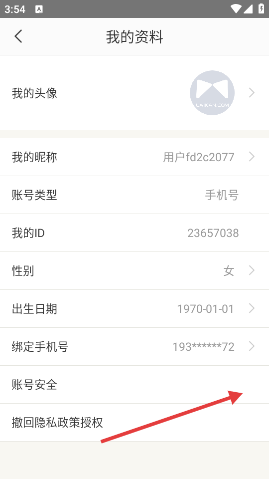 3、在我的资料页面点击【账号安全】选项,进入申请注销账号页面。