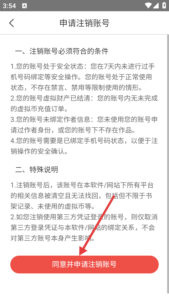 4、在申请注销账号页面点击【同意并申请注销账号】按钮,完成账号注销申请操作。