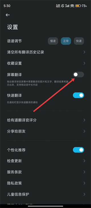 3、在设置页,找到【屏幕翻译】开关并开启,这样就离使用悬浮窗翻译更近一步啦。