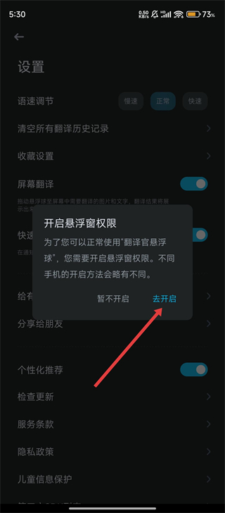 4、接着在悬浮窗权限提示中点击【去开启】,完成权限设置,便能顺利使用悬浮窗翻译功能啦。