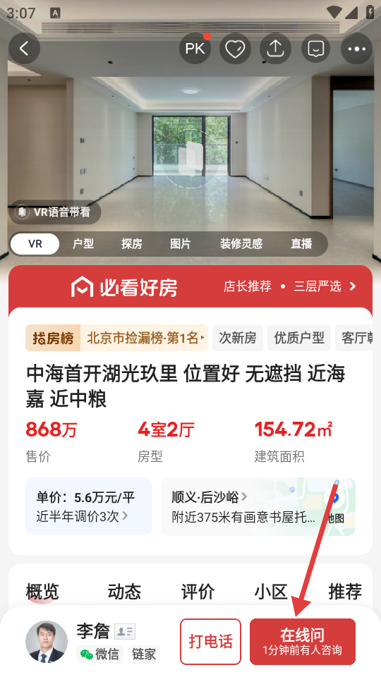 3、在房源详情页面点击【在线问】按钮,进入与经纪人的聊天页面。