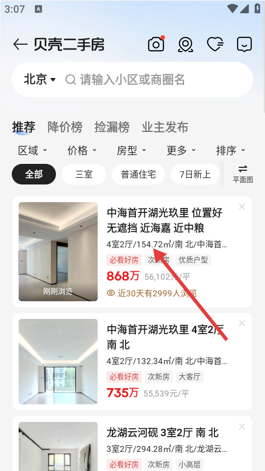 2、在贝壳二手房页面点击目标房源条目,进入房源详情页面。