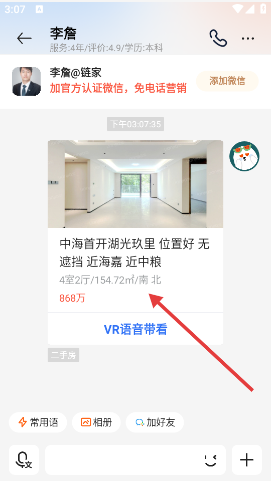 4、在聊天页面中,可与经纪人李詹咨询房源的相关信息。