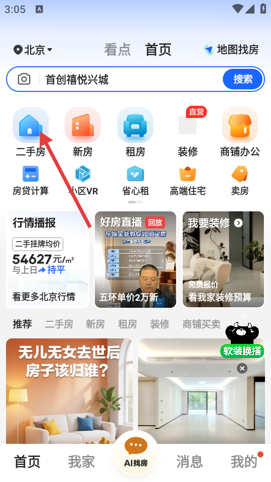 1、在首页点击【二手房】选项,进入贝壳二手房页面。