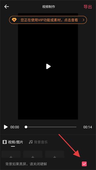 4、在视频制作页,确认素材后勾选【背景如果黑屏-请关闭硬解】,准备导出相册视频。