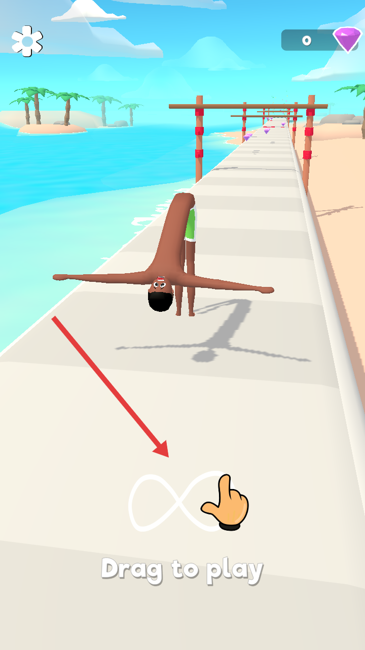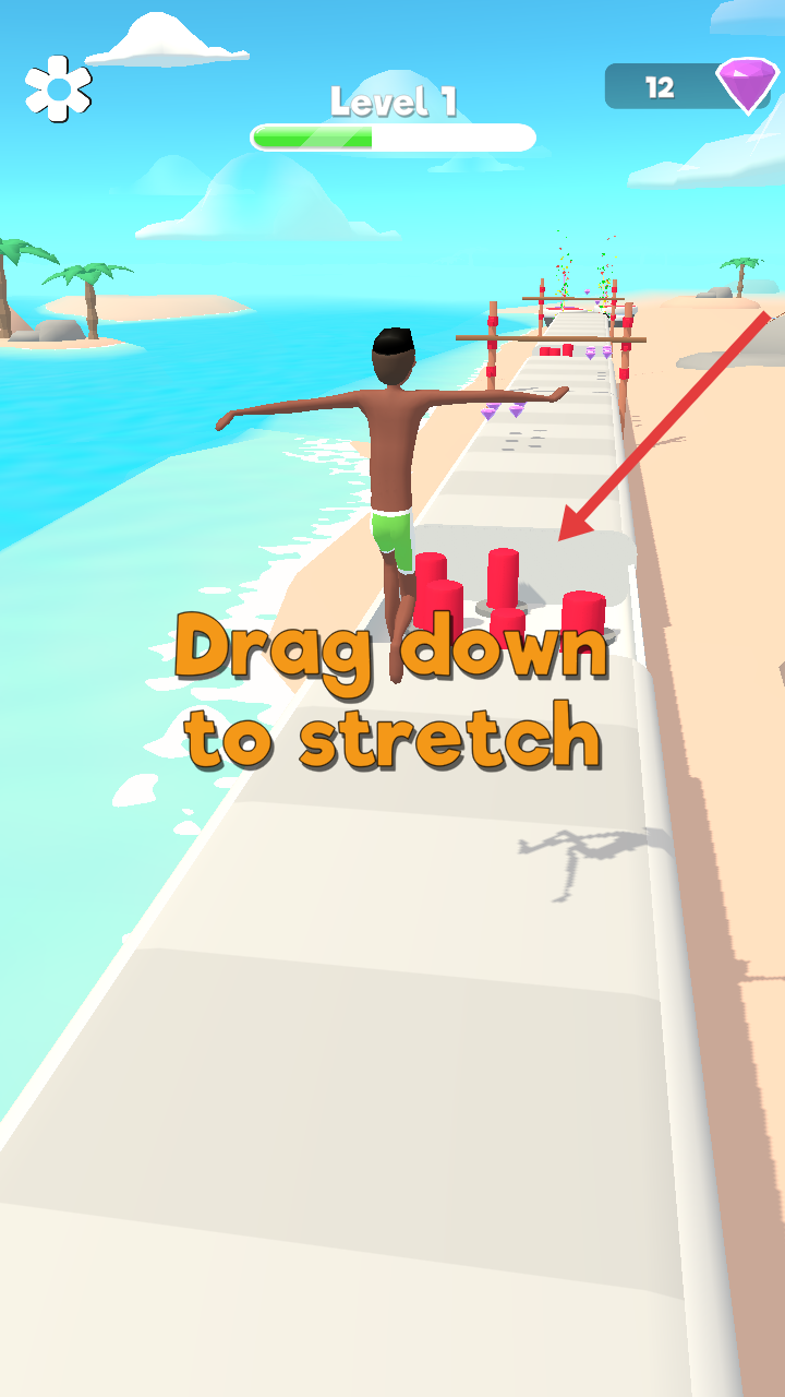 2、在赛道上收集钻石,同时根据提示拖动角色进行拉伸,躲避红色障碍物。