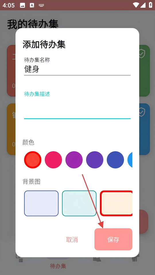 3、在“添加待办集”弹窗中,输入待办集名称(如【健身】),选择颜色、背景图等,点击【保存】。