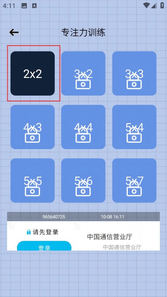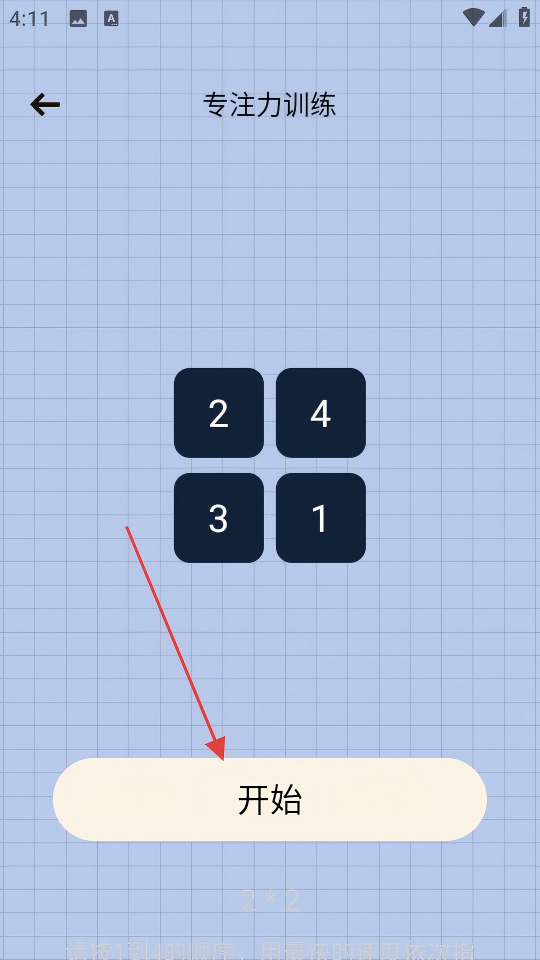 4、进入【2x2】专注力训练界面后,点击【开始】按钮,完成训练。