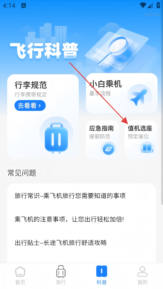 3、在飞行科普页面,找到并点击【值机选座】板块,进入值机选座详情页。