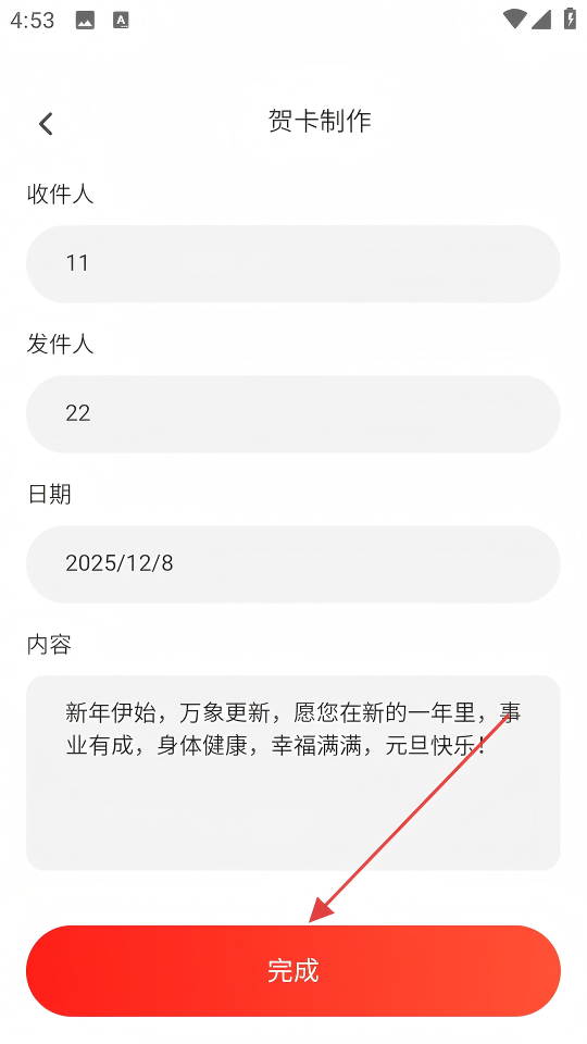 4、在贺卡制作页面,填写收件人、发件人、日期等信息后,点击【完成】按钮,完成贺卡制作。