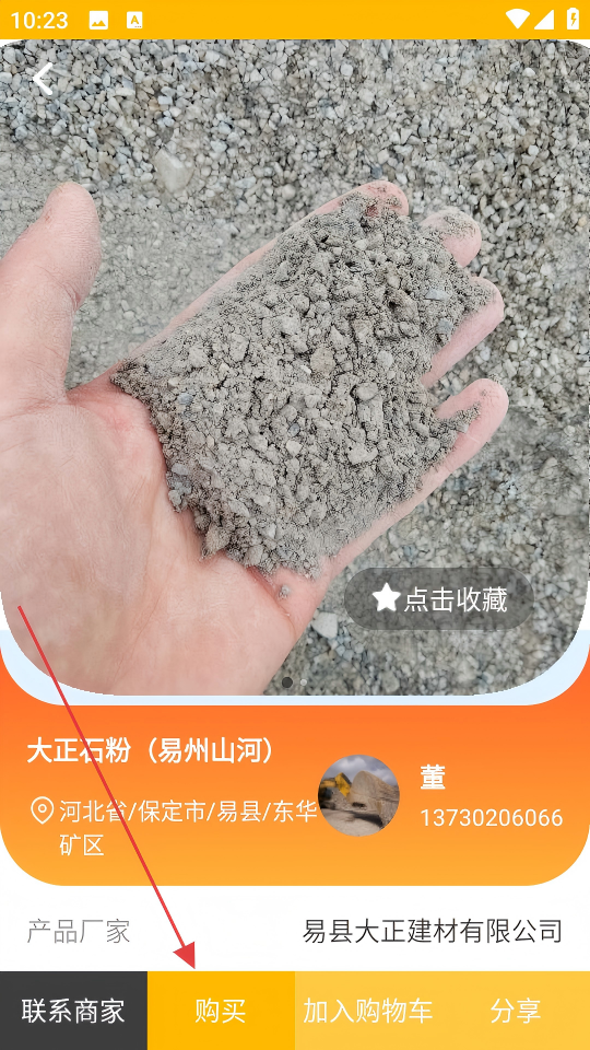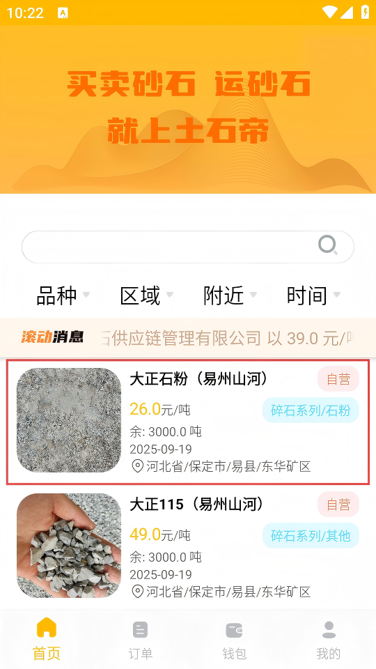 1、打开“土石帝”APP,在首页浏览砂石商品,如点击“大正石粉”,进入该商品详情页。