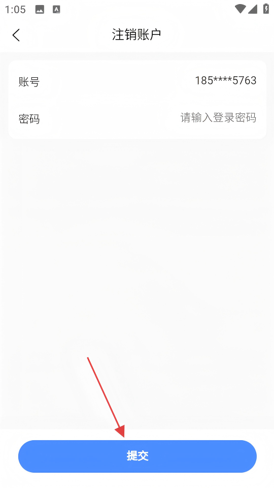 4、在注销账户页面,填写账号与登录密码后,点击【提交】按钮,完成账户注销流程。