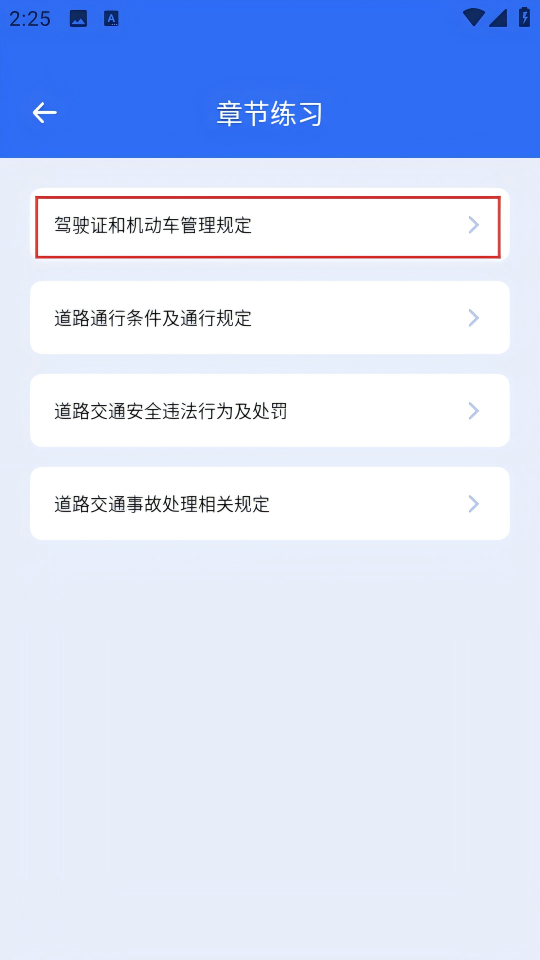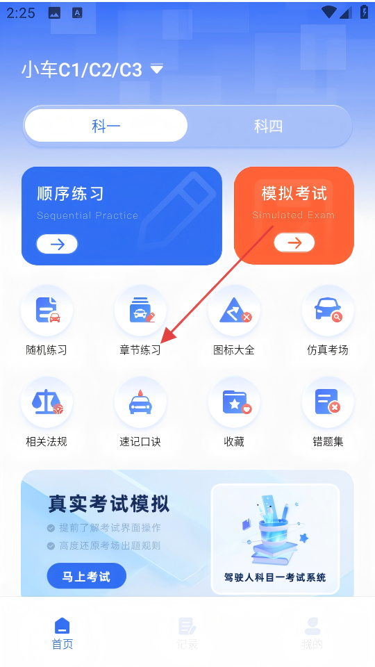 1、打开驾考APP,在首页点击【章节练习】,进入章节列表页面。