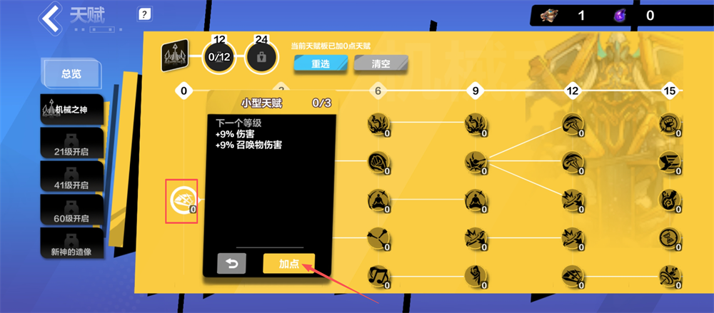 4、进入【机械之神】天赋加点界面,点击小型天赋的【加点】按钮,提升伤害和召唤物伤害,强化角色战斗能力。